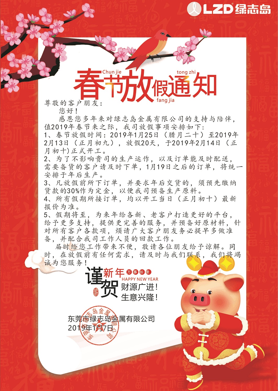綠志島2019年春節放假通知