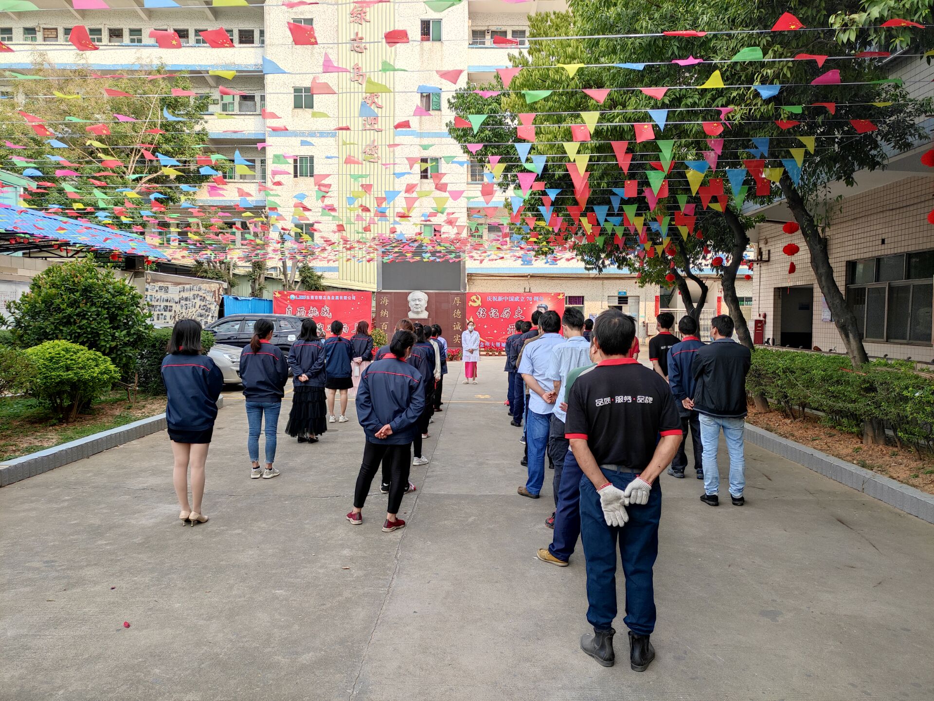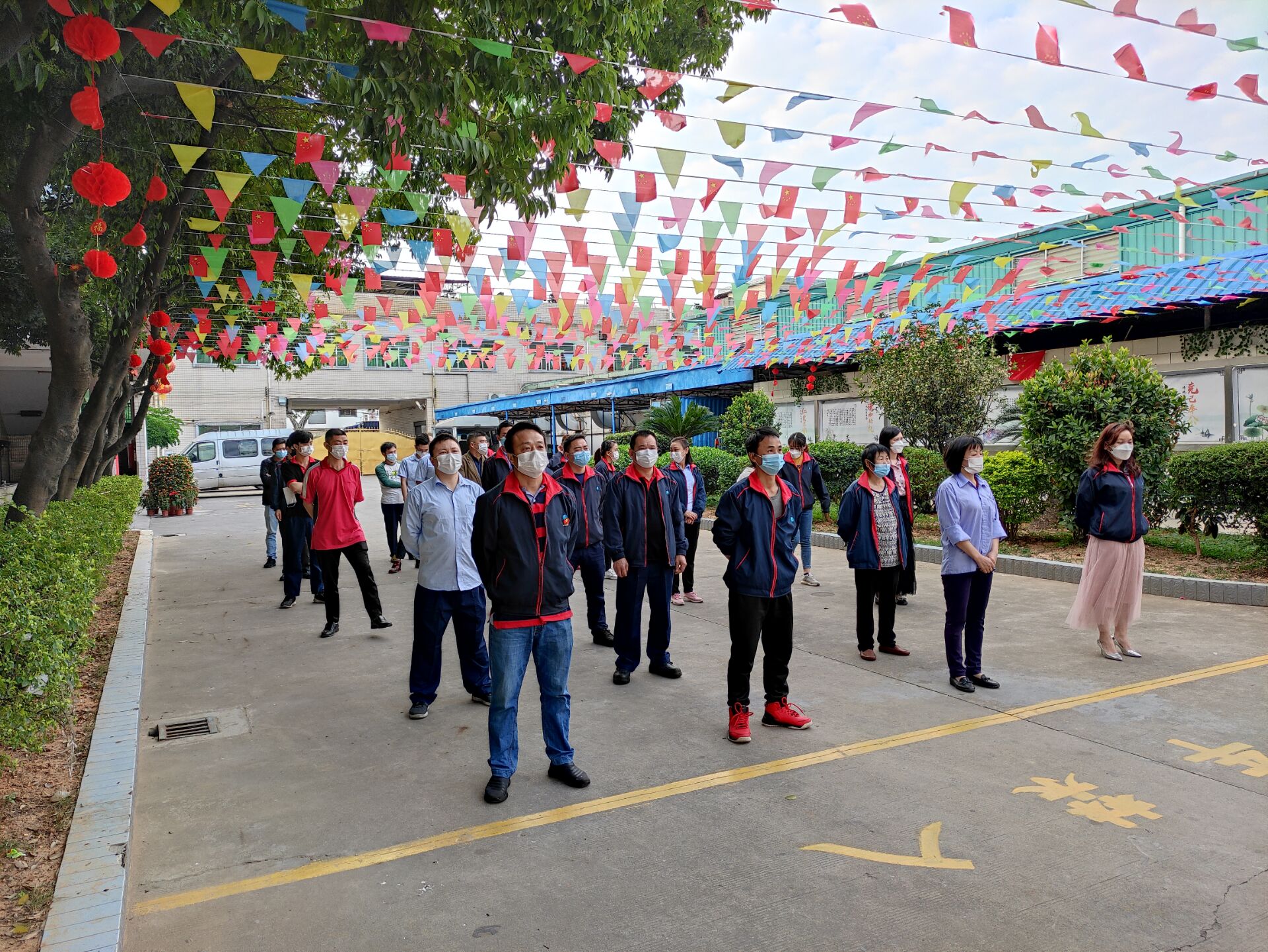 周一早會(huì)盧經(jīng)理在室外給上崗人員宣導(dǎo)防疫知識(shí)
